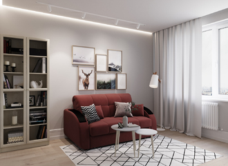 Спинка, выполненная в обивочной ткани, позволяет ставить диван в центре комнаты и зонировать пространство.