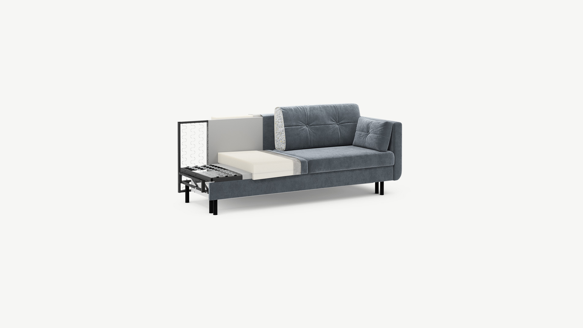 Механизм трансформации «Пантограф» подходит для ежедневного использования. Диван легко раскладывается и складывается, не повреждая напольное покрытие. Диван стоит на четырех основных опорах, в то время как дополнительные остаются скрытыми, появляясь плавно и бесшумно в единственно нужный момент — при трансформации дивана в кровать.