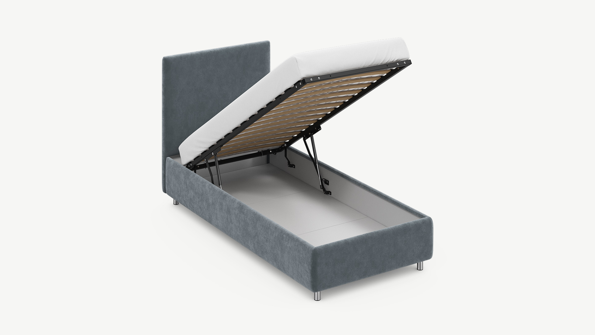 - Скрытая под основанием вместительная емкость без внутренних перегородок позволяет использовать всю площадь подкроватного пространства для хранения вещей.