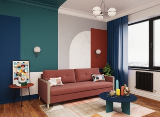 Спинка, выполненная в обивочной ткани, позволяет ставить диван в центре комнаты и зонировать пространство.