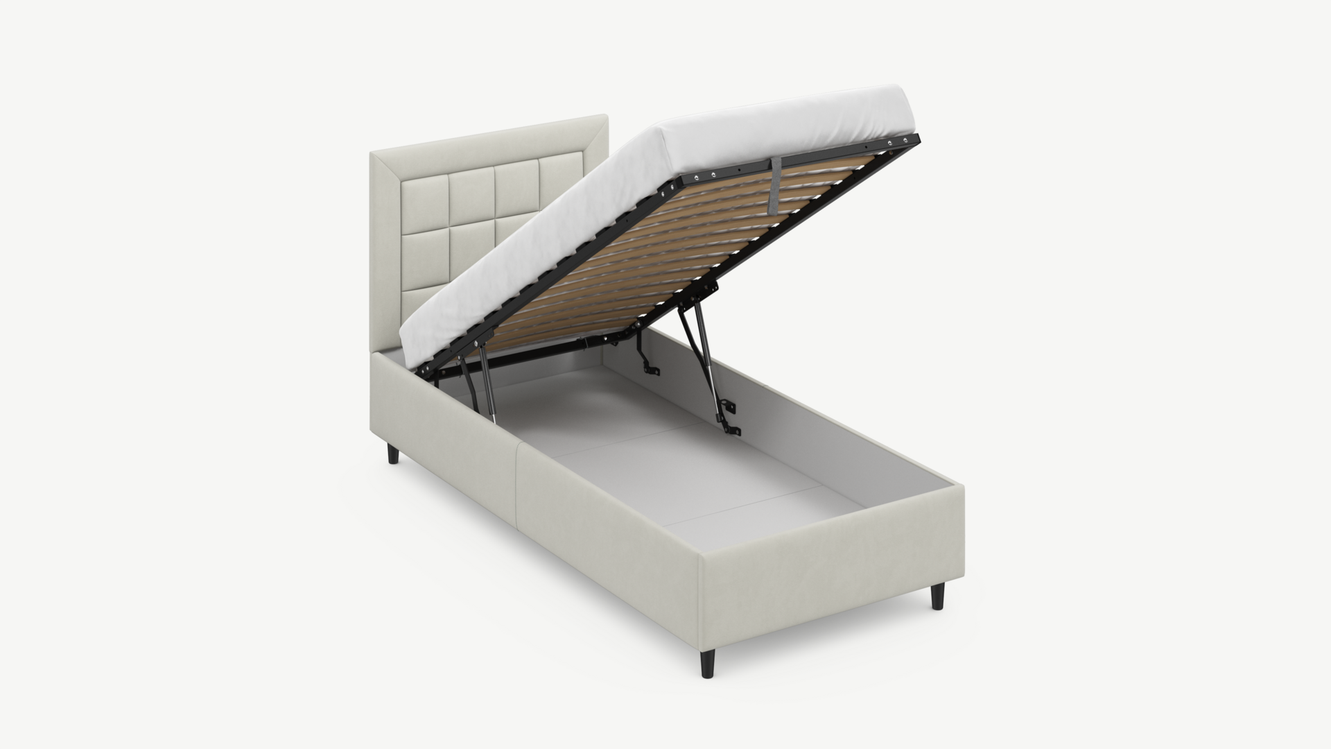 Вместительная емкость под кроватью без внутренних перегородок позволяет использовать для хранения вещей 100% пространства.