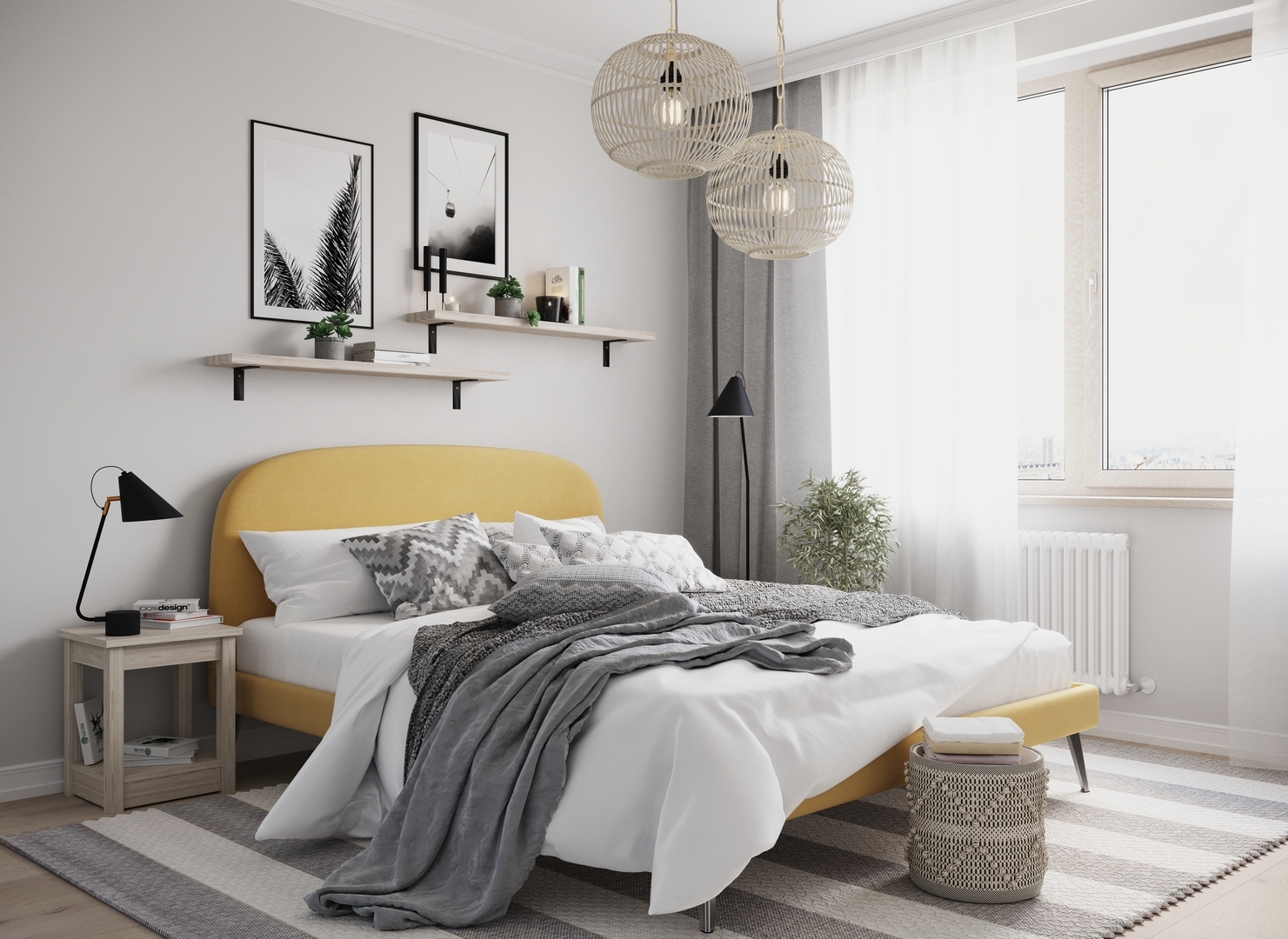 Создать гармоничный интерьер и завершить образ спальни помогут дополнительные аксессуары, например: тумбы, банкетки, подушки.