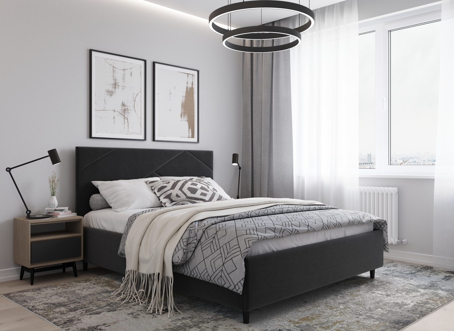 MOON FAMILY 1257 привлекает внимание оригинальным исполнением: широкие полосы ткани эффектно пересекают периметр изголовья, создавая на нем графический орнамент. Лаконичные формы объемных царг создают единый гармоничный образ и фокусируют внимание на центральном текстурном элементе кровати.