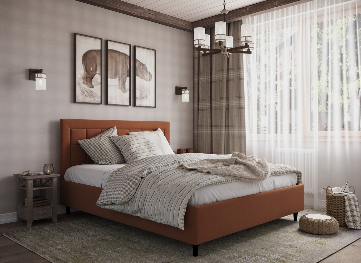 Стежка помещена в центр изголовья и обрамлена, словно картина. Объемные царги завершают цельную фигуру кровати и становятся гармоничным дополнением ее образа.