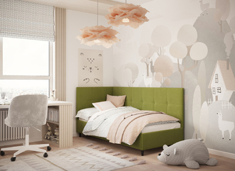 Угловая односпальная кровать MOON FAMILY 1261 с мягкой спинкой и изголовьем создаст в Вашей спальне ощущение уюта. Крупная квадратная стежка привносит в интерьер графических акцентов, а вставка из пуговиц наполняет пространство ощущением домашнего тепла.