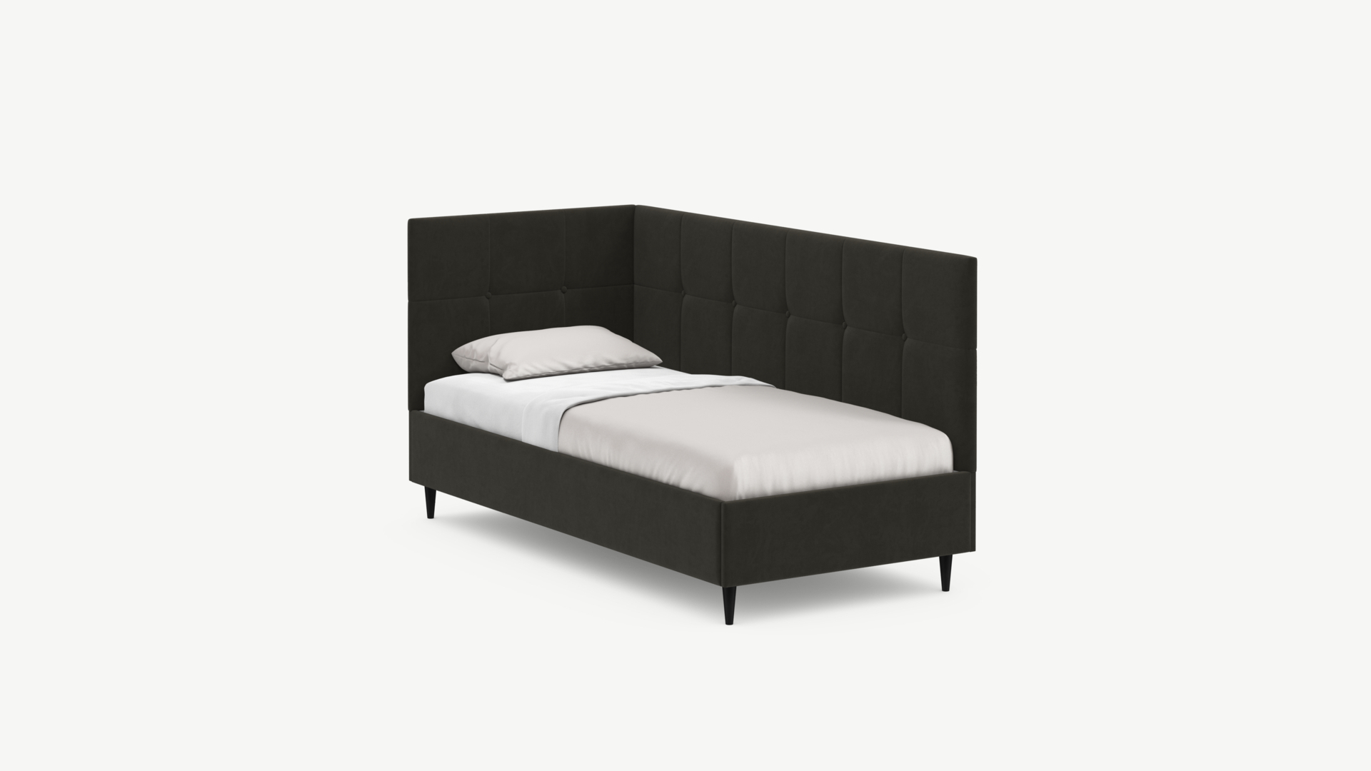 Угловая односпальная кровать MOON FAMILY 1261 с мягкой спинкой и изголовьем создаст в Вашей спальне ощущение уюта. Крупная квадратная стежка привносит в интерьер графических акцентов, а вставка из пуговиц наполняет пространство ощущением домашнего тепла.