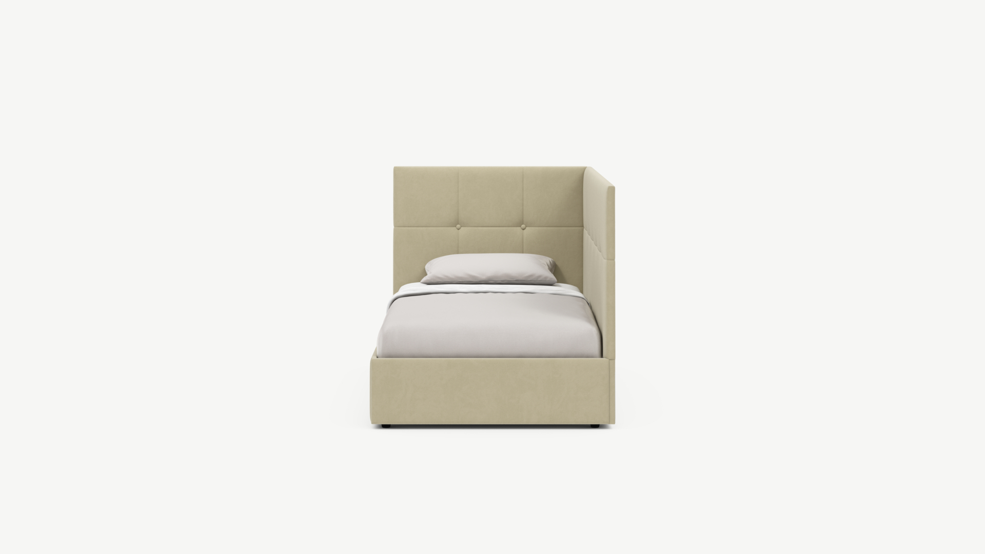 Угловая односпальная кровать MOON FAMILY 1261 с мягкой спинкой и изголовьем создаст в Вашей спальне ощущение уюта. Крупная квадратная стежка привносит в интерьер графических акцентов, а вставка из пуговиц наполняет пространство ощущением домашнего тепла.