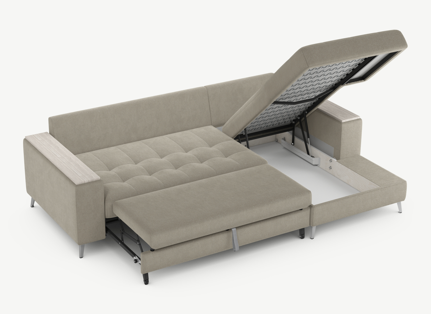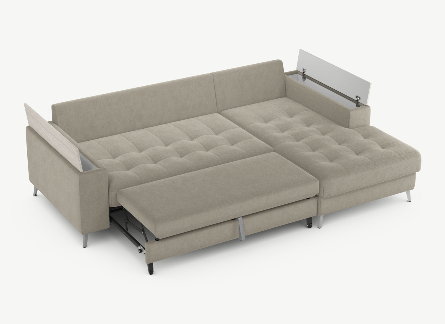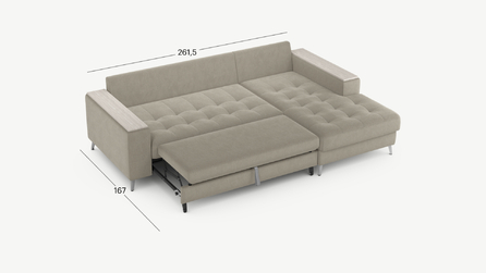 Секция «канапе» обеспечивает дополнительное пространство для отдыха, благодаря которому Вы можете располагаться с максимальным комфортом, удобно вытянув ноги. Под данной секцией расположен вместительный бельевой короб.