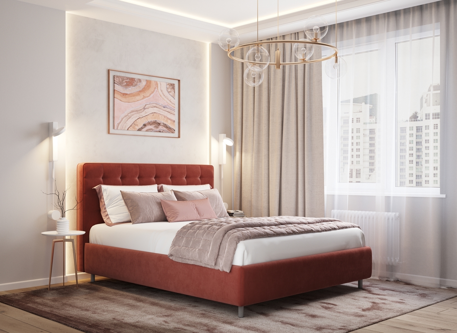 Оформите образ кровати, выбирая обивочный материал, который подчеркнет звучание Вашей спальни и отразит Ваш вкус. Обратите внимание на однотонный гладкий велюр, который усиливает объемную фактуру стежки.