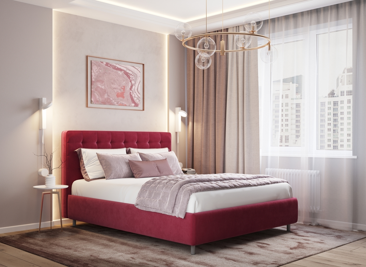 Оформите образ кровати, выбирая обивочный материал, который подчеркнет звучание Вашей спальни и отразит Ваш вкус. Обратите внимание на однотонный гладкий велюр, который усиливает объемную фактуру стежки.