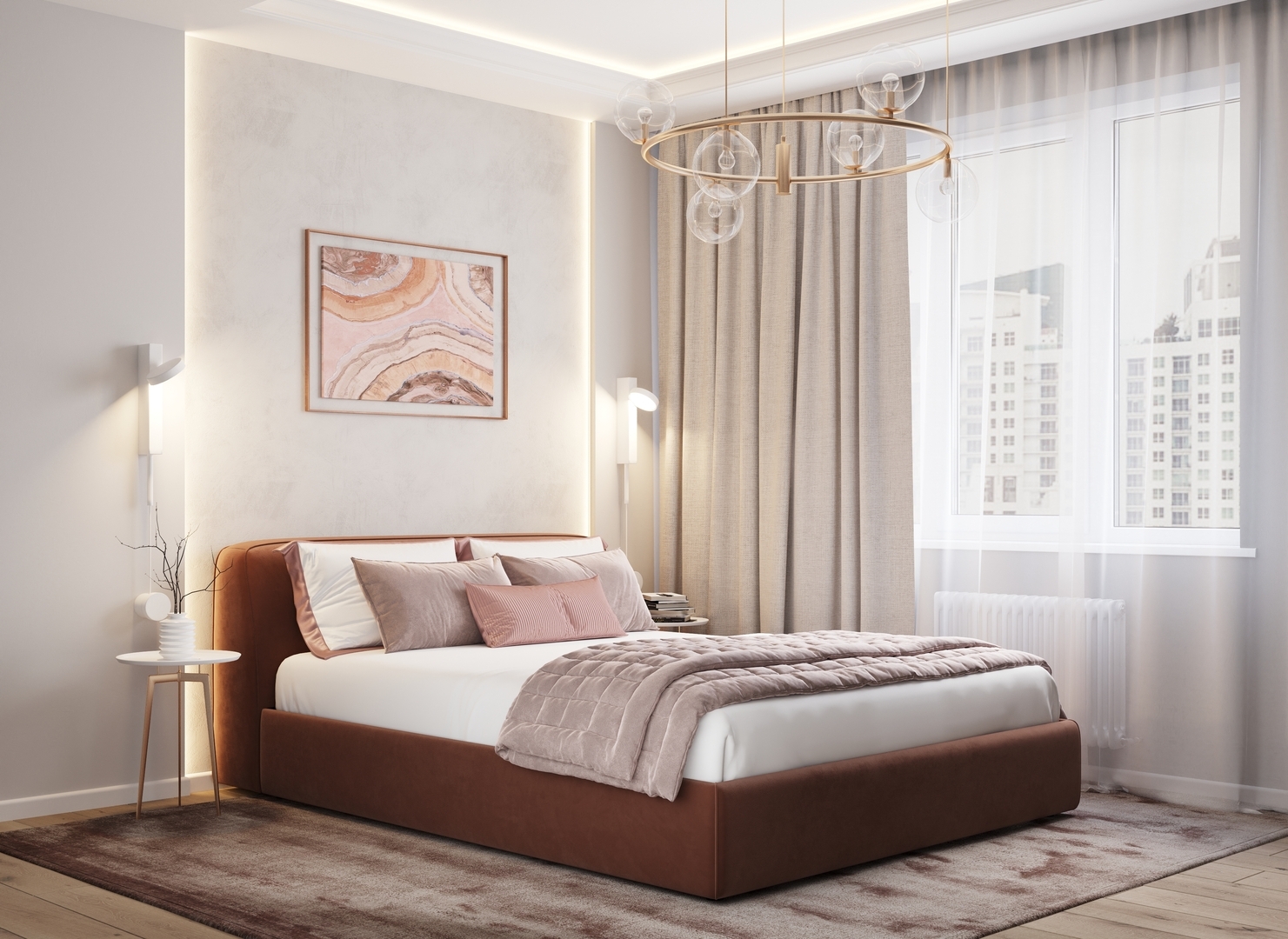 Творчески завершить образ спальни помогут дополнительные аксессуары: декоративные подушки, тумбы, а также покрывала-саше.